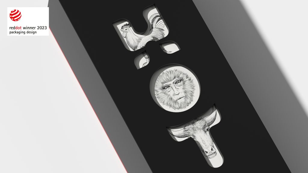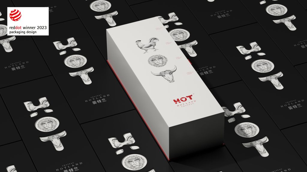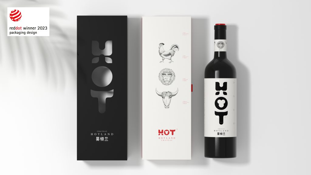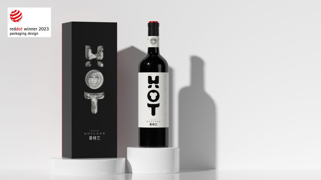 我们将品牌英文的字母HOT分别设计成鸡、猴、牛的抽象形态,H=鸡=守信,O=猴=聪明,T=牛=勤劳。寓意酒庄三个主人的身份以及他们酿造产品的良苦用心。